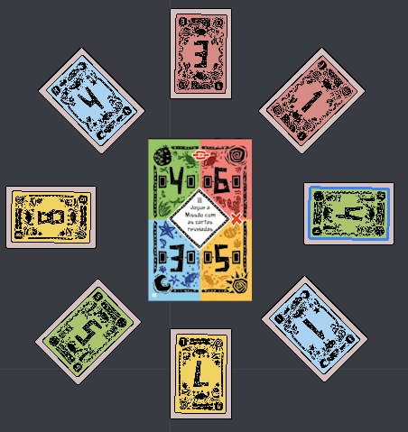 - Cada jogador recebe 8 cartas (2 de cada cor), embaralha e forma um círculo de cartas viradas para baixo.